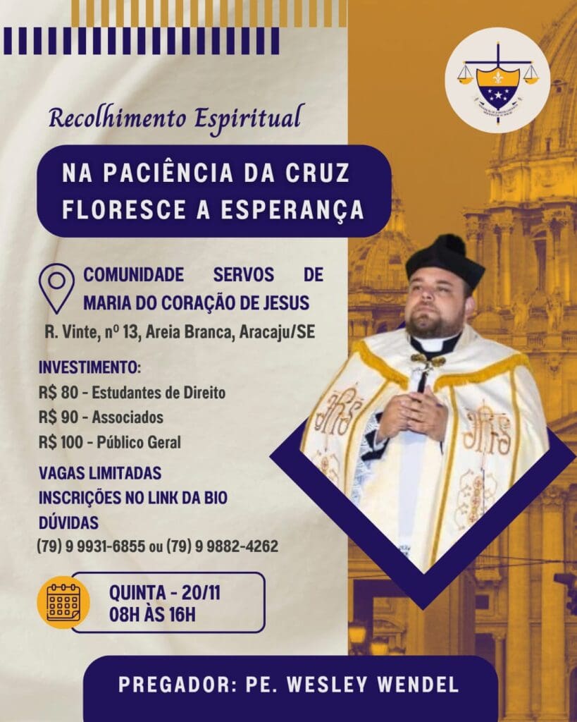 A Associação dos Juristas Católicos de Sergipe (AJUCAT) realizará, no dia 20 de novembro de 2025, o Recolhimento Espiritual AJUCAT 2025, um encontro voltado a juristas, operadores do Direito e estudantes da área jurídica que desejam viver um dia de profunda experiência espiritual e renovação da fé. O evento acontecerá das 8h às 16h, na […]