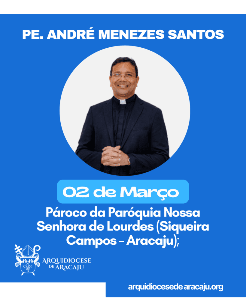 A Arquidiocese de Aracaju convida todos os fiéis para a Santa Missa com rito de posse do Padre André Menezes como novo pároco da Paróquia Nossa Senhora de Lourdes. A celebração acontecerá hoje, na Paróquia Nossa Senhora de Lourdes, localizada no bairro Siqueira Campos, em Aracaju. A Santa Missa será presidida pelo arcebispo metropolitano, Dom […]
