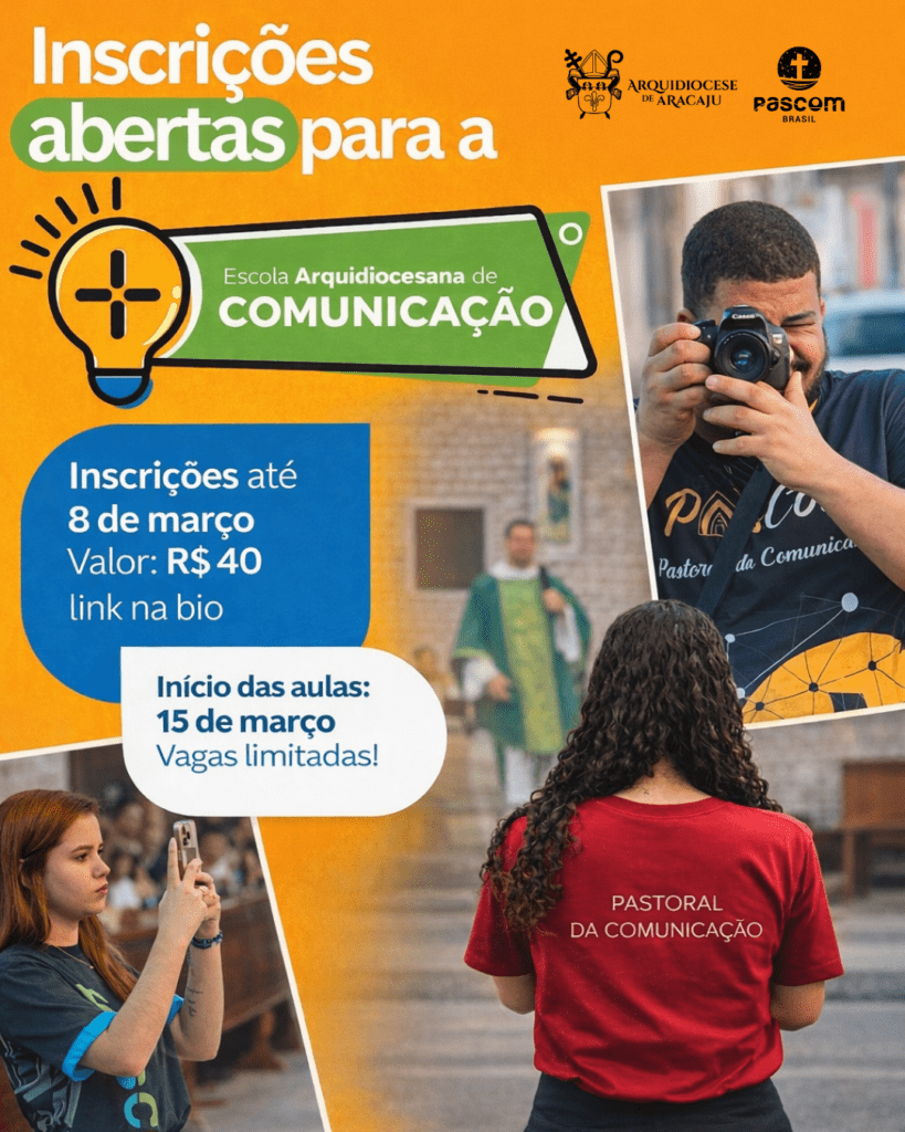A Arquidiocese de Aracaju, por meio da Pastoral da Comunicação (Pascom), está com inscrições abertas para a Escola Arquidiocesana de Comunicação. Os interessados podem se inscrever até este domingo, 8 de março. A iniciativa tem como objetivo oferecer formação para agentes da Pascom e para todos aqueles que desejam comunicar com propósito, fé e responsabilidade […]