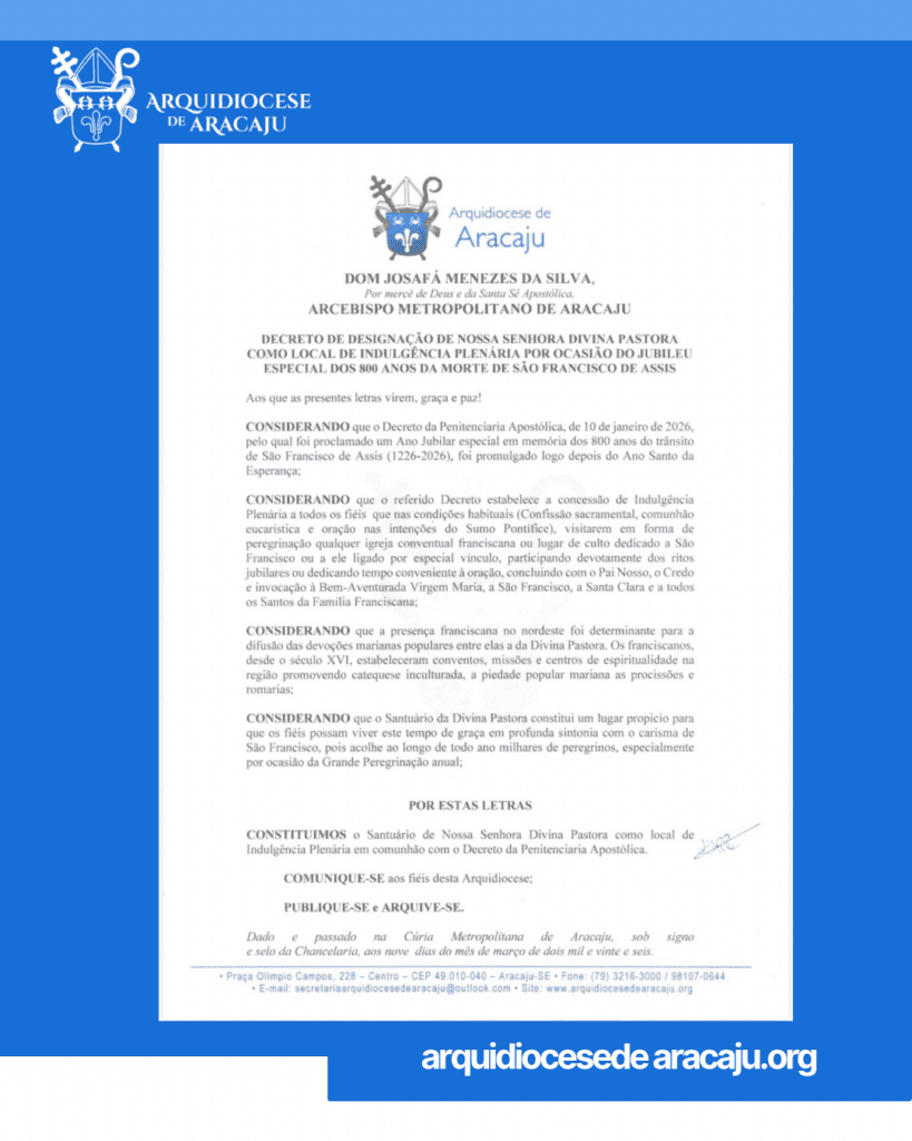 O arcebispo metropolitano de Aracaju, Dom Josafá Menezes da Silva, publicou decreto no qual designa o Santuário de Nossa Senhora Divina Pastora como local de obtenção de indulgência plenária na Arquidiocese de Aracaju por ocasião do Jubileu especial que recorda os 800 anos da morte de São Francisco de Assis. O jubileu foi proclamado por […]