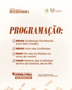 A Arquidiocese de Aracaju convida todos os fiéis a participarem da Jornada Arquidiocesana da Misericórdia, que será realizada no dia 6 de dezembro de 2025 (sábado), a partir das 8h da manhã, na Catedral Metropolitana de Aracaju. O evento será o último grande encontro do Ano Jubilar 2025, dedicado à Esperança, e promete ser um momento de intensa oração, reconciliação e vivência da fé.