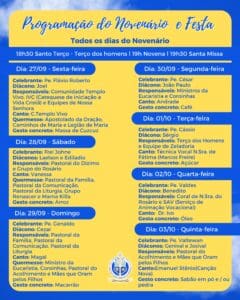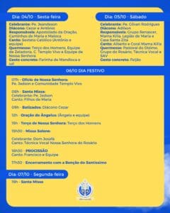 No dia festivo, haverá o Ofício de Nossa Senhora (7h), Santa Missa com o padre Jadson (8h), batizados (9h), Oração do Ângelus (12h), Terço de Nossa Senhora (15h), Missa solene com o arcebispo metropolitano, dom Josafá Menezes (15h30), seguida de procissão e bênção do Santíssimo.