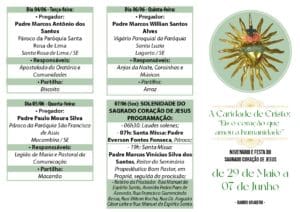 Em todas as noites, haverá, a partir das 18h, exposição do Santíssimo Sacramento, Novena do Sagrado Coração de Jesus e Santa Missa (19h).