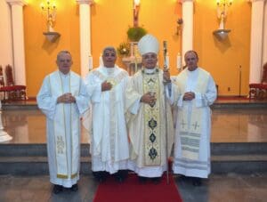 Concelebraram a Santa Missa os padres Cássio, Francisco de Assis e José Bernardino Santana Filho, pároco da paróquia São José Operário e vigário forâneo (Forania Mãe do Criador).