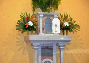 O presbitério do templo, espaço onde o sacerdote, diácono e demais ministros exercem o seu ministério, também ganhou um novo crucifixo e um novo suporte para o tabernáculo eucarístico. Os móveis, entre eles a cadeira presidencial, foram restaurados.