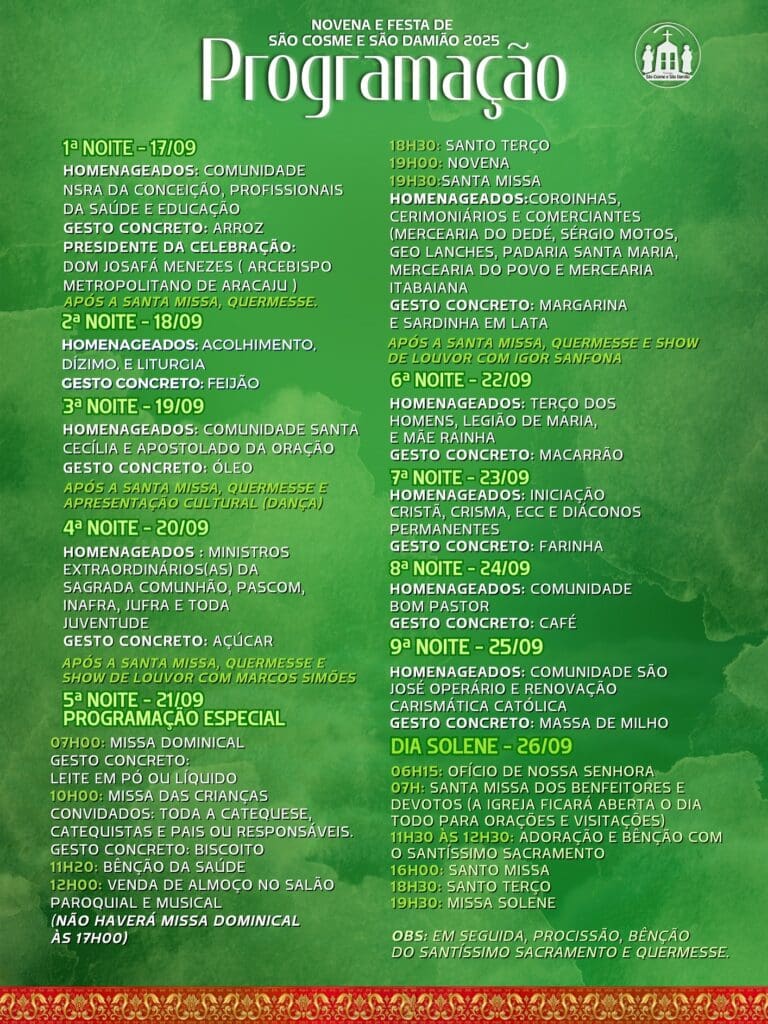 A Paróquia São Cosme e São Damião, no bairro Olaria (zona oeste de Aracaju), promove de 17 a 26 de setembro de 2025 a tradicional novena e festa em honra aos padroeiros. Com o tema “Firmes na esperança, somos de Cristo, a exemplo de São Cosme e São Damião”, a programação contará diariamente com Santo Terço (18h30), novena (19h) e Santa Missa (19h30).