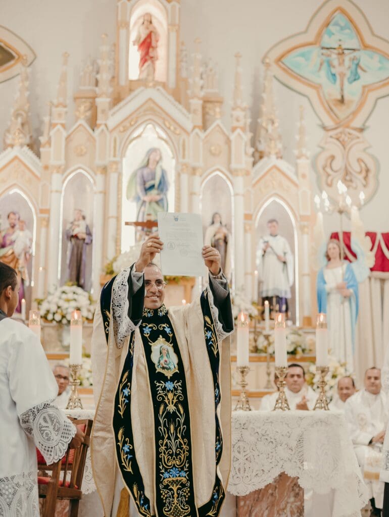 Durante a celebração, padre Marcos Rogério professou publicamente a fé e fez o juramento de fidelidade, como determina o Código de Direito Canônico. Em seguida, recebeu os símbolos próprios de sua missão, como as chaves da igreja e o assento presidencial, que o habilitam a exercer plenamente o cuidado pastoral da comunidade paroquial.