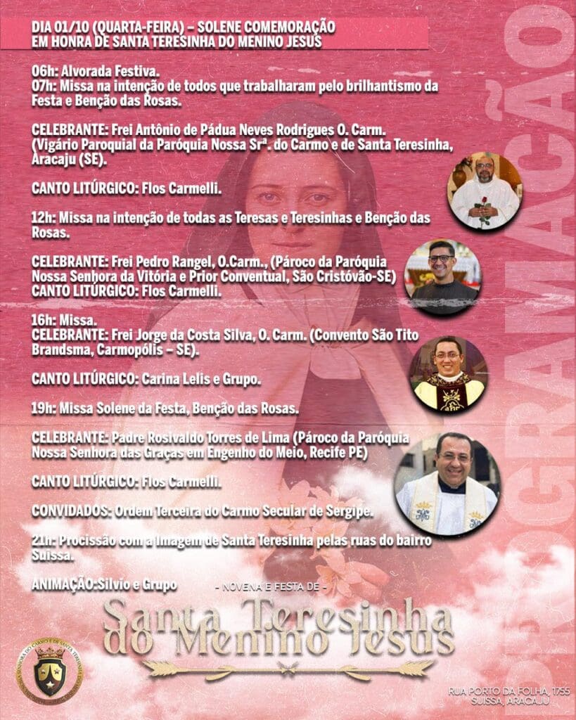 No dia 1º de outubro, a comunidade celebrará a festa solene de Santa Teresinha do Menino Jesus. A programação terá início às 6h, com a Alvorada Festiva, seguida de Santa Missa às 7h em intenção de todos os colaboradores da festa. Ao longo do dia, outras Missas serão celebradas às 12h, 16h e 19h, todas com a tradicional bênção das rosas.