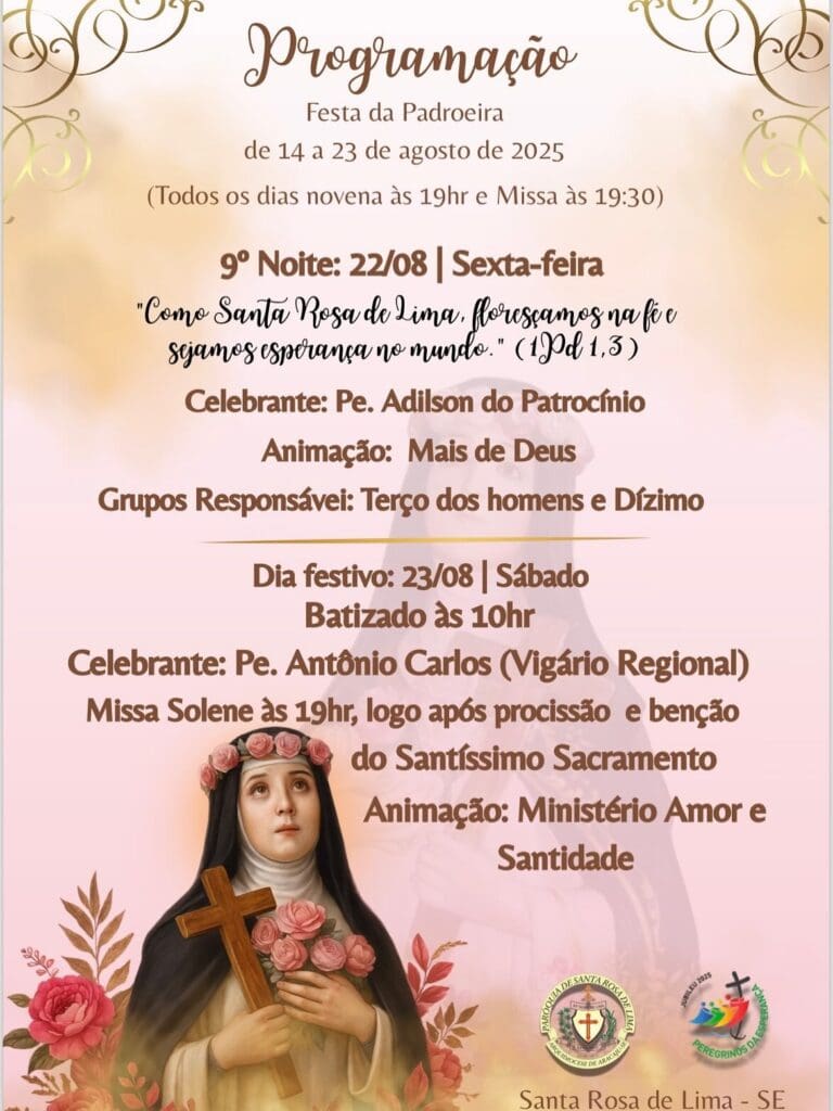 De 14 a 23 de agosto, a Paróquia Santa Rosa de Lima, localizada no município de Santa Rosa de Lima-SE, celebrará com fervor o novenário e festa de sua excelsa padroeira, primeira santa das Américas e modelo de santidade, pureza e penitência.