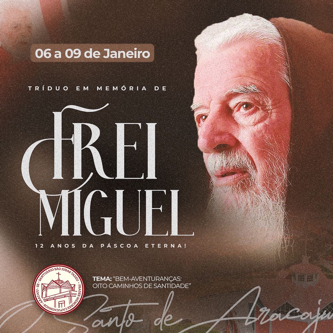 De 6 a 9 de janeiro, o Santuário São Judas Tadeu, em Aracaju, promoverá o Tríduo em memória de Frei Miguel, missionário capuchinho, pelos 12 anos de sua Páscoa eterna. O tema deste ano é “Bem-aventuranças: Oito caminhos para a santidade”, inspirado nos ensinamentos de Jesus.